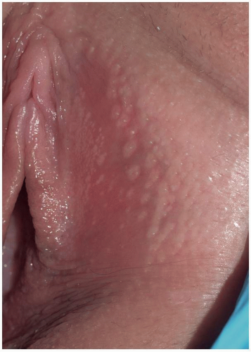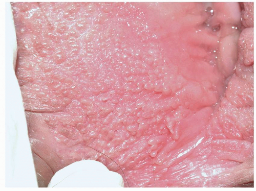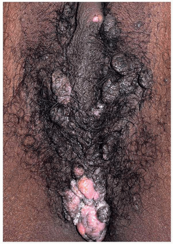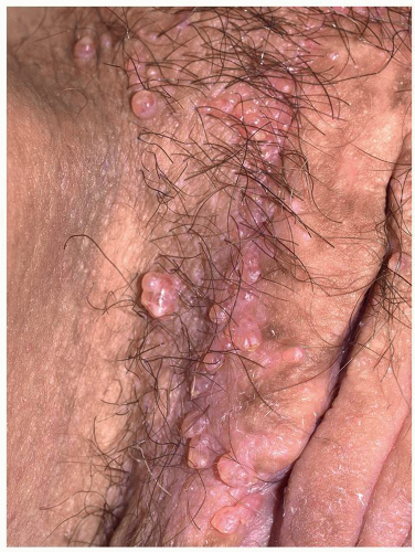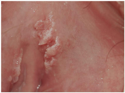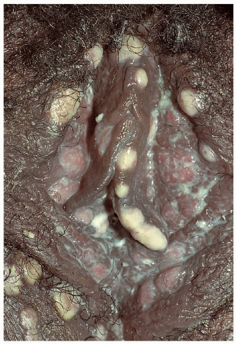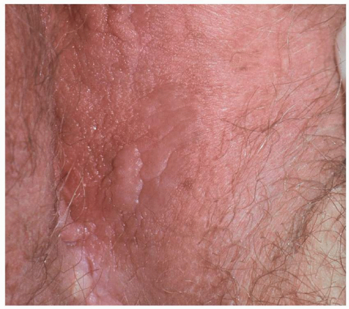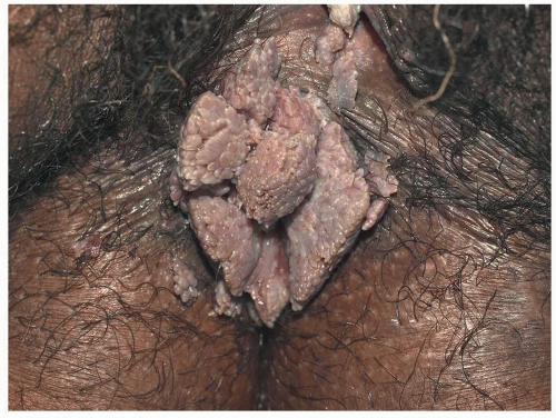 Condylomata lata are sharply demarcated, large (1- to 2-cm), flat-topped, moist, skin-colored or pink papules (Fig. 5.16). When the lesions are located on a moist or mucosal surface, they often exhibit a white surface because of retained moisture (Fig. 5.17). They are most commonly found on the vulva and the perianal area but can occur elsewhere on the genitalia and perigenital skin. As opposed to the other cutaneous lesions of secondary syphilis, the lesions of condylomata lata are teeming with spirochetes and pose a high risk for transmission to others. Condylomata lata are usually associated with other signs and symptoms of secondary syphilis such as fever, malaise, and generalized lymphadenopathy. Other skin findings of secondary syphilis such as