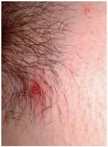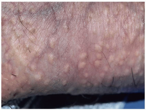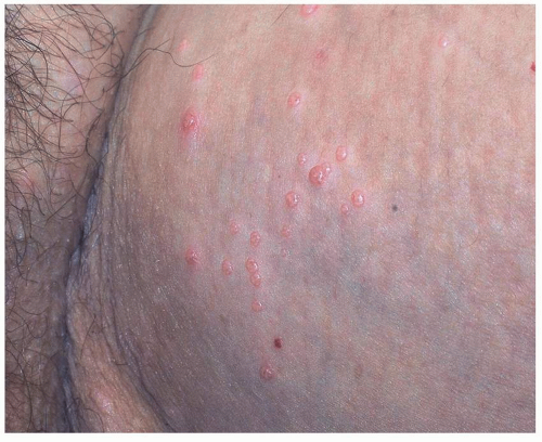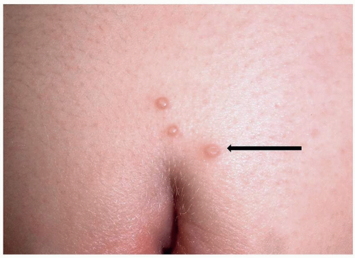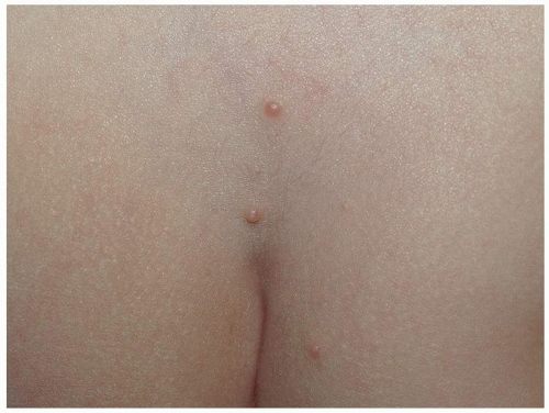 The papules of molluscum contagiosum characteristically have a central depression or umbilication. However, many lesions, especially early and small lesions, lack this feature (Fig. 5.14). Although this umbilication may not be seen in every lesion, a careful examination usually shows at least some umbilicated lesions. Sometimes, the papules of molluscum contagiosum mimic vesicles, thus accounting for the lay term “water warts” (Fig. 5.15). Molluscum contagiosum is typically asymptomatic, but some patients may experience low-grade pruritus. Lesions in children may be found anywhere on the skin, but most often, the trunk is affected. Lesions in adults, because of sexual transmission, are most commonly located on the mons, the medial thighs, and the buttocks. They are less often found on the penis and on the labia.