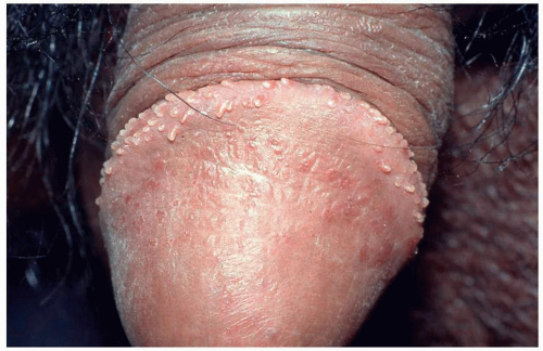 There are four major morphologic variants of genital warts. Those found in persistently moist areas tend to be skin colored and filiform (e.g., tall and narrow) with or without a brushlike tip (Fig. 5.1). This variant is appropriately termed “condylomata accuminata” and, strictly speaking, is the only variant for which this term should be used. The second variant occurring in the anogenital area is verruca vulgaris (common warts) (Fig. 5-2). These are skin colored and similar in appearance to hand warts. They are about as wide (5 to 10 mm) as they are tall and typically have palpable, if not visible, surface roughness due to the presence of scale. They are located on the drier aspects of the anogenital tissue. Smooth-surfaced, flat-topped papules (wider than they are tall) represent the third variant (Fig. 5.3). These are usually 3 to 15 mm in diameter but individual lesions may coalesce to form slightly elevated plaques several centimeters or more in diameter. They can occur on either moist or dry surfaces. While often skin colored, these flat-topped warts may also be pink, red, brown, or black. Large globular warts, 2 to 4 cm in diameter, correspond to the fourth variant (Fig. 5.4). They have a smooth, but often cauliflower-like surface and are skin colored, pink, or red in hue. This type of lesion is often termed a giant condyloma or Buschke-Lowenstein tumor.
