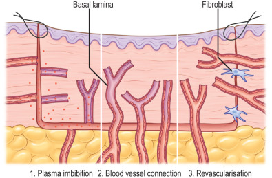 Skin grafts are avascular patches of skin that are transferred to an open wound. Skin grafting allows for coverage of large open wounds quickly and with minimal morbidity. Grafting takes advantage of the body’s ability to regenerate partial-thickness skin defects by borrowing from normal skin that can regenerate quickly and by giving to large wounds that otherwise would take significant time to heal. This procedure is possible because the body can quickly revascularize the graft over the course of 3 to 7 days before necrosis occurs. Revascularization occurs via a graduated process: The graft is initially nourished by oxygen diffusion from the wound bed in the first 24 hours, with revascularization occurring in the subsequent 24 to 48 hours ( Fig. 2.1.1 ). Thus any clean wound with a well-vascularized bed can accept a skin graft. Wounds with denuded bone, tendon, or exposed implants will not accept a graft.