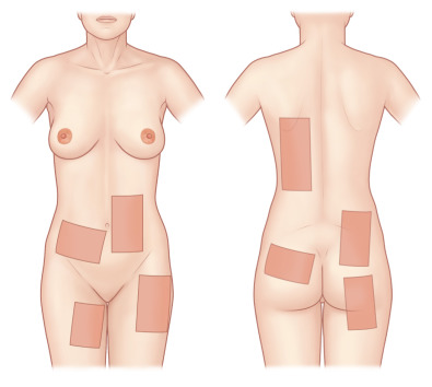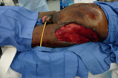 Subsequently, the surgeon must determine what type of graft will be utilized and what the donor site will be. Skin grafts serve a functional purpose of wound coverage as well as an aesthetic purpose in restoring anatomical form to a region. Functionally, the surgeon must determine the size of the area to be covered and the effect of contracture on the reconstructed area. The options for skin graft types are split-thickness and full-thickness grafts. Split-thickness grafts include the epidermis and a thin layer of dermis. Split-thickness grafts are less resistant to long-term wound contracture, but can be harvested in large amounts because the donor sites retain skin appendages and can re-epithelialize on their own. The most common locations for split-thickness skin graft harvest are the lateral thighs and trunk ( Fig. 2.1.5 ). Full-thickness grafts, in contrast, have less long-term wound contracture but are limited in size. Because the entire thickness of dermis is harvested with a full-thickness graft, all skin appendages are removed, precluding the donor site from healing on its own. Full-thickness graft donor sites should be small enough to be closed primarily. Thus full-thickness grafts are generally used in esthetically demanding areas, such as the face. Areas in which wound contracture would result in poor functional outcome may need full-thickness grafts (i.e., digits) or “thick” split-thickness grafts (i.e., joints). Considering that the dermis provides strength and stability to the skin, the thinner the graft, the less stable and more prone to breakdown it will be. Importantly, thicker skin grafts have a longer distance for nutrient diffusion and thus should not be used in wound beds with tenuous blood supply.