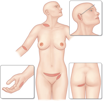 Esthetically, the surgeon must try to match the color and texture of the skin in the region, and again must take into consideration the effects of wound contraction. Skin from the same area, contralateral side, or a similar area will generally give the best color and texture match. For wounds of the face, full-thickness supraclavicular, pre- or posterior auricular, or upper eyelid grafts are good options ( Fig. 2.1.6 ).