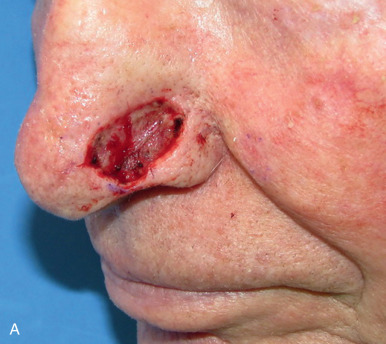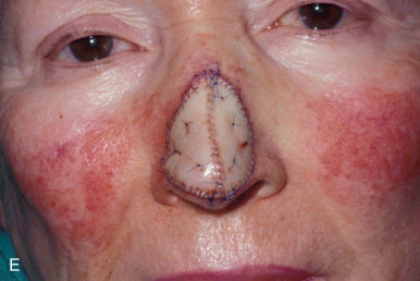 The distal third of the nose is significantly more sebaceous, and is better matched by a conchal bowl, forehead, or nasolabial skin. In women, the submental crease provides another excellent option. Grafts chosen for soft triangle and alar rim defects are often buttressed with cartilage to avoid notching. A Burow graft from a cephalad vertical triangle of skin can be harvested and transplanted into a more caudal defect. When designing a Burow graft, the triangle of skin should be of sufficient height so as to avoid significant tension in closing donor site when the graft is repositioned in its more caudal position. Failure to do so may lead to contralateral alar flare when using the Burow graft to repair nonmidline defects. A Burow graft can also be used to repair complex wounds spanning the medial cheek and nasal sidewall. First, a template of the defect confined to the nasal sidewall is created. The entirety of the medial cheek defect to its junction with the nasal sidewall is closed with a rotation or fusiform advancement flap, ensuring that the distal standing triangle is of sufficient size to serve as an FTSG for the nasal sidewall. The FTSG is then transplanted to the nasal sidewall defect and sutured into place. Defects of the columella are also well suited to repair with an FTSG.