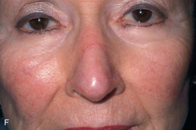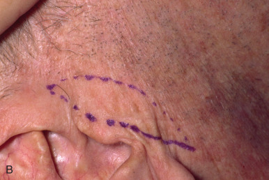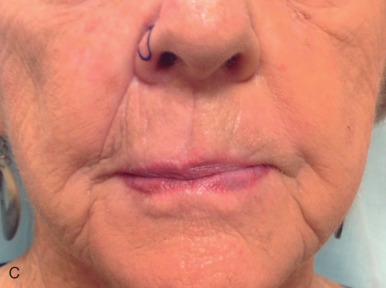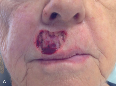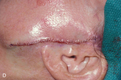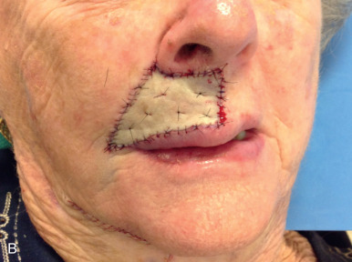 Grafts can be used throughout the face, although their use is less common than in ear, eyelid, and nose reconstruction. Their less frequent use is likely attributable to the availability of local tissue to closed primarily or with a local flap and the increased variability of the final cosmesis of grafts. Still, they are arguably less taxing on the patient and can be revised or even surgically extirpated at follow-up, and may represent the best choice for many patients. When encountered with massive defects of the forehead, temple, and cheek, the reconstructive surgeon is occasionally left no option but to repair all or part of a defect with an FTSG. In the cheek, FTSG, harvested either from the supraclavicular fossa or regionally (in the form of a standing triangle) can be paired with a rotation, rhombic, or V-to-Y advancement to repair sizable defects. The forehead, given its relatively inelastic nature, is less forgiving than the cheek. The forehead is most frequently repaired with an FTSG from the supraclavicular fossa or from a Burow graft of the temple or frontal scalp (in an alopecic male). A novel method of FTSG for the upper forehead and scalp, presented by Dr. David Brodland, is the marriage of a simple purse string closure with an FTSG. The defect is initially partially closed with purse string, and a template of the new, smaller defect is made. The FTSG, often harvested from the supraclavicular fossa, is sewn into place. The purse string is then released, drawing the graft over the defect like a drum head. This repair both reduces the size of the grafted area and provides a taut appearance to the FTSG that replicates the appearance of normal forehead or scalp. Grafting on the lip can prove invaluable in select scenarios. Very superficial defects involving delicate structures such as the philtral ridges can be grafted with thin FTSGs, often from the postauricular sulcus. If an entire cosmetic subunit has been extirpated, it can be redraped with a more sizable graft. As the lip is a very dynamic anatomic structure, the use of basting sutures and bolster dressings can aid in graft survival ( Fig. 9.4 ).