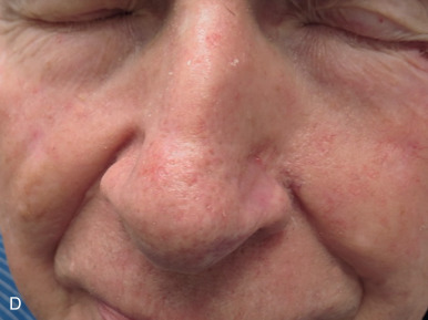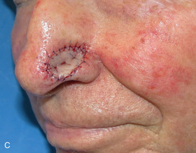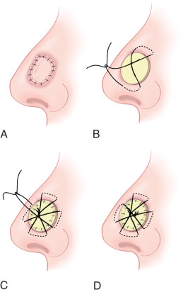 Once the donor site has been closed, attention is redirected to inset of the graft into the recipient wound. The graft is stripped of subcutaneous fat, exposing the glistening white underbelly of the dermis. This is most commonly achieved by draping the graft over the digital pulp of the surgeon’s nondominant second digit, and tangentially snipping fat with sharp scissors. In deeper defects of the nose, some have achieved success leaving 1 to 5 mm of subcutaneous fat to add bulk and volume to match the defect. The authors recommend tie-over bolster dressing rather than bolster sutures for this type of less viable FTSG to improve adherence and take. This variation should be approached with caution in active or even former tobacco smokers. Conversely, the dermis can be thinned if necessary to match the depth of a thin defect, but this may damage adnexae and deter from the final cosmesis of the graft.