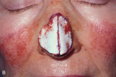 When reconstructing a wound on the nose with an FTSG, tremendous attention to the qualities of the skin and the individual cosmetic units of the nose is paramount. In general, the skin of the upper two-thirds of the nose (Zone 1) is thin and mobile relative to the thick, sebaceous lower third (Zone 2). This transition is highly variable among patients and must be closely studied prior to the design of a repair. Additionally, the nose is divided into cosmetic subunits based on convexities, concavities, natural borders, and the quality of skin. In certain instances, wounds may be extended so as to graft an entire subunit. The cephalad two-thirds of the nose lends itself quite well to skin grafting. The dermis in this region is of medium thickness, and the skin of the preauricular cheek lateral to the sideburn or the postauricular sulcus (if the skin of the recipient site is notably thin) are good matches ( Fig. 9.1 ). In males, an area of approximately 1.5 to 2 cm in the horizontal dimension can be harvested from the preauricular cheek without incorporating the terminal hairs of the sideburn. In women, the graft can be larger, but will likely include delicate vellus hairs that may detract from the cosmesis of the final appearance. In larger repairs, a defect template can be halved vertically, and two grafts can be harvested from the glabrous skin of a single preauricular donor site ( Fig. 9.2 ). The two grafts heal as one, especially if sutured together along the midline or along a cosmetic subunit. When sizable defects are involved, supraclavicular skin can be used, but caution must be taken to thin the dermis to an appropriate thickness to avoid a patchlike blob of tissue.