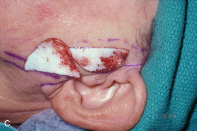 Wounds of the ear are also commonly repaired by FTSG. Many superficial wounds of the auricle, not involving the helical rim or sulcus, lobule, tragus, or antitragus, heal beautifully with second intention healing and require no reconstructive intervention. Wounds of the helical rim, however, often heal with perceptible notching. Similarly, defects involving the sulcus between the helix and antihelix can web and distort anatomic landmarks. Broad wounds of the auricle with exposed perichondrium can be resurfaced with a thin FTSG. In broad wounds with exposed perichondrium, strips of cartilage can be excised from the triangular fossa, antihelix, and concha prior to placing an FTSG over the entirety of the defect. This allows for imbibition and eventual anastomosis to arise from the skin and subcutaneous tissues of the medial ear. The auricle is best grafted with tissue from the postauricular sulcus, and the graft must be adequately thinned so as not to obscure the intricate topography of the ear. Thin freehand grafts harvested with double-edged razor blades from the mastoid process can be used to cover broad, thin wounds. The donor site is then allowed to heal secondarily.