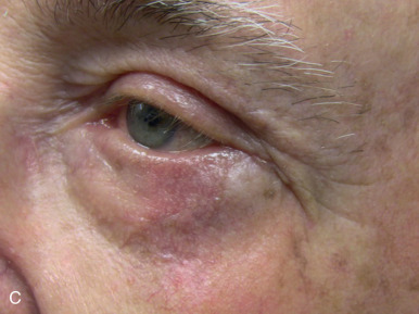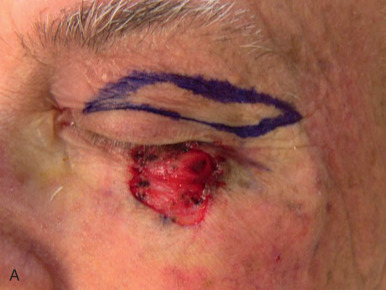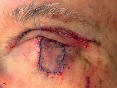 Eyelid defects involving exclusively the anterior lamella can be reproducibly reconstructed with FTSG. Defects of the eyelid are best repaired using FTSG of the upper eyelid or postauricular sulcus. Judicious use of Frost sutures when reconstructing periorbital defects is recommended to avoid ectropion ( Fig. 9.3 ). An option for large defects abutting the lower eyelid is to use guiding sutures to reduce defect size and optimize tension vectors in combination with FTSG, but leaving the guiding sutures intact during the healing phase. Careful postoperative observation is critical in the grafting of eyelids, and small aliquots of high-potency intralesional triamcinolone into early hypertrophic scarring will often stave off or reverse ectropion. This observation, coupled with the selective use of the Frost suture to suspend the lower lid by its tarsal plate, can significantly reduce the risk of eyelid malpositions. FTSG of the medial canthus is an excellent reconstructive choice because the graft can be appropriately thinned and made to fit into the contours of the defect with tacking sutures or a well-placed bolster. Local flaps, by contrast, tend to recruit excessive bulk. Grafts for the medial canthus are often obtained from the preauricular cheek or postauricular sulcus.