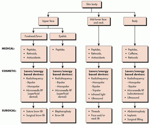Skin laxity is a primary finding in skin aging and manifests as sagging of the skin. The survey by the American Society for Dermatologic Surgery reported that 67% of the population seeks treatment to sagging skin on jawline and neck.1 From 1900 to 1990, plastic surgery, including rhytidectomy or the surgical face lift, was the primary cosmetic treatment option for skin laxity. In the 1990s, ablative resurfacing lasers were introduced and applied to achieve facial skin tightening.2 Despite high efficacy for rhytid reduction, ablative devices required significant recovery time, prolonged wound healing, and an increased risk of side effects and complications. Nonablative and minimally invasive technologies with little to no recovery time and a more favorable risk-reward profile without epidermal vaporization were subsequently developed. In the early 2000s, skin tightening energy-based technologies were developed, including radiofrequency (RF) and infrared wavelengths. Although the gold standard of skin tightening remains surgical rhytidectomy or redraping, patients continue to demand for treatment alternatives in light of the anesthesia risks, morbidity, and the potential for unwanted cosmetic outcomes associated with plastic surgery. Nonsurgical skin tightening technologies are not yet a replacement for those with advanced to severe skin laxity but provide alternative for mild to moderate skin laxity candidates willing to accept less efficacy in exchange for facile recovery and rare risk of side effects or complications (see Table 4.5.1).