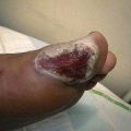 Patient with wet necrosis extending to the deep fascia tissue and debridement was performed. Note the extent of necrosis after the debridement of all necrotic tissue