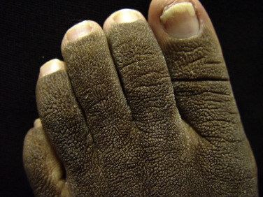 The characteristic clinical feature of acanthosis nigricans (AN) is hyperpigmented, velvety thickening of the skin on intertriginous surfaces. The eruption usually affects the axillary vault ( Fig. 17-1 ), neck, inguinal crease, nipples, and umbilicus, but may also involve areas of trauma, such as the elbows, knees, and knuckles. Frequently, the oral mucosa has a papillomatous thickening. In rare instances, the eruption can become generalized ( Fig. 17-2 ). Verrucous or papillary lesions may accompany the typical lesions of AN. Patients may develop multiple seborrheic keratoses simultaneously.