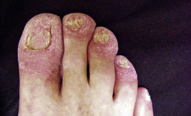 Acrokeratosis paraneoplastica, or Bazex syndrome, is by definition always associated with an underlying malignancy. Acrokeratosis paraneoplastica develops progressively through three stages. The initial cutaneous signs consist of erythematous to violaceous, poorly defined macules with a fine adherent scale that occur over the acral areas of the body, including the fingers, toes, ears, and nose. A paronychial reaction is also common. In the second stage, skin lesions begin to generalize and keratoderma develops. In the third stage, the eruption generalizes but still maintains its violaceous nature and predilection for acral involvement ( Fig. 17-3 ). The three stages of the cutaneous disease parallel the growth and spread of the underlying tumor. Bazex syndrome is more common in men, and the underlying tumors are most often squamous cell carcinomas of the upper aerodigestive tract; however, a variety of other solid malignancies and lymphomas have also been associated. Therefore, a comprehensive head, neck, and pelvic examination with laboratory, radiographic, and endoscopic evaluation is needed. As with acanthosis nigricans, the course of cutaneous involvement in Bazex syndrome typically parallels the course of the tumor, thereby fulfilling the criteria to consider it a marker of internal malignancy.