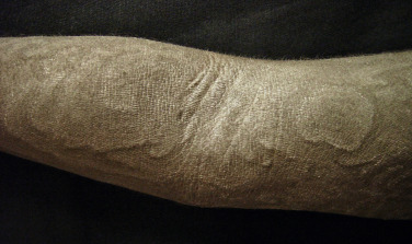 There are multiple figurate erythemas, but the only one that appears to be truly related to malignancy is erythema gyratum repens. In this eruption, erythematous lesions form gyrate or serpiginous bands that rapidly spread across the cutaneous surface ( Fig. 17-5 ), producing a “wood-grain” appearance. Nearly all patients with erythema gyratum repens have an associated malignancy, which is often discovered concurrently. The course also frequently parallels that of the neoplasm. Although any malignancy may be associated, lung cancer is the most common, followed by breast, genitourinary (GU), and gastrointestinal (GI) tumors. The presence of erythema gyratum repens mandates an extensive internal evaluation for malignancy.
