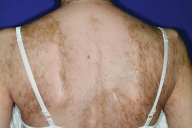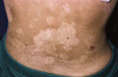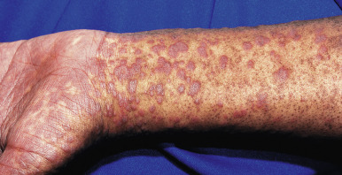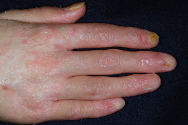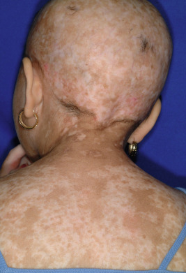 cGVHD often manifests with generalized cutaneous involvement ( Table 25-3 ). Early lesions may resemble lichen planus with flat-topped violaceous papules and plaques (including mucosal changes of lichen planus) ( Figs. 25-6 and 25-7 ) (see Chapter 4 ). Lichenoid lesions may be localized to Blaschko lines or to the site of previous herpes zoster infection. Some patients with cGVHD manifest acquired ichthyosis that resembles ichthyosis vulgaris ( Fig. 25-8 ) or lichen sclerosus ( Fig. 25-9 ). Later changes of cGVHD include generalized xerosis, patchy dyspigmentation ( Fig. 25-10 ), progressive poikiloderma, sclerodermatous changes with joint contracture and ulcerations ( Figs. 25-10 through 25-13 ), cicatricial alopecia ( Fig. 25-14 ), and nail dystrophy resembling that of dyskeratosis congenita (see Chapter 7 , Fig. 7-63 ). Disseminated porokeratosis has also been described after stem-cell transplantation and may respond to acitretin administration.