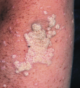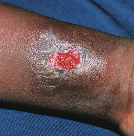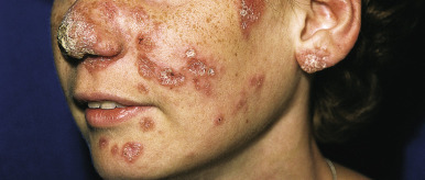 Patients with LAD have frequent skin infections (especially facial cellulitis and perianal infection), mucositis, and otitis, with a 5- to 20-fold increase in peripheral blood leukocytes. Poor wound healing is characteristic and leads to paper-thin or dysplastic cutaneous scars. Minor skin wounds may become large ulcerations that resemble pyoderma gangrenosum ( Fig. 25-3 ), especially if secondarily infected. Periodontitis is a typical feature, and if severe, may lead to loss of teeth. Bacterial and fungal infections may be life-threatening. Delayed separation of the umbilical cord is a common historic clue to the diagnosis. Psoriasis has been described in affected individuals with mild disease.