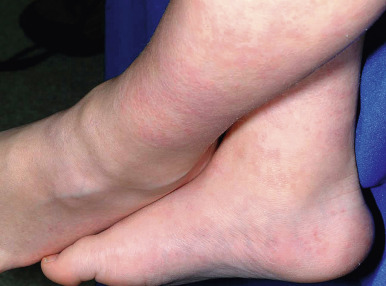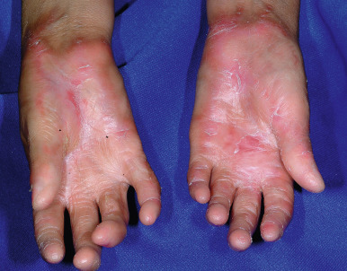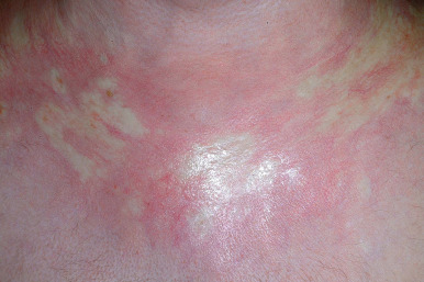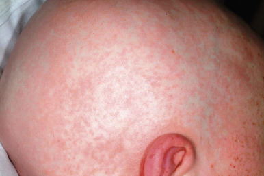 The response to the host can be early (acute) or late (chronic). aGVHD classically develops during the first 100 days (usually 2 to 4 weeks) but can be persistent, recurrent or late onset, and usually involves the skin, gastrointestinal tract, and liver (in that order of incidence). Patients who receive autologous transplants may have a mild cutaneous form of aGVHD that occurs 1 to 3 weeks after transplantation and resolves spontaneously. Reactions to transfusions often occur 7 to 10 days after the transfusion. The most common cutaneous manifestation of aGVHD is erythematous macules and maculopapules that often begin on the ears, face, neck, palms, and soles and then become generalized ( Figs. 25-4 and 25-5 ). The cutaneous eruption may become confluent and desquamate. Mild to moderate aGVHD most often presents with a nonspecific cutaneous eruption and thus can be confused with infection (especially viral), drug reaction, and reactions related to the transplant (e.g., the self-limited eruption of lymphocyte recovery, engraftment syndrome (which is characterized by associated fever and vascular leak with weight gain, edema, ascites, pulmonary infiltrates and hypotension), and toxic erythema of chemotherapy (which is painful and usually localized to the palms, soles and intertriginous areas. Severe aGVHD may resemble exfoliative erythroderma or toxic epidermal necrolysis. Patients with aGVHD may complain of nausea or crampy abdominal pain and have watery or bloody diarrhea, hepatomegaly, and hepatic function abnormalities. Many patients are anorexic and have fever.