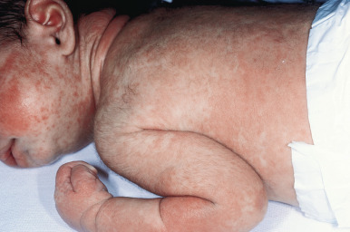 Infants may present have a generalized seborrheic-like dermatosis, a morbilliform eruption, or exfoliative erythroderma with alopecia. Extensive cutaneous inflammation is a characteristic of 98% of infants with Omenn syndrome, a subset of SCID with reticuloendothelial cell proliferation. Patients with Omenn syndrome typically show hepatosplenomegaly (88%), lymphadenopathy (80%), alopecia (57%), eosinophilia, and a high serum IgE level. Oral and genital ulcers are characteristic of defects in patients with an Artemis mutation, especially in Athabaskan-speaking American Indian children. Multicentric dermatofibrosarcoma protuberans and pulmonary alveolar proteinosis have recently been described in association with ADA deficiency.