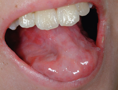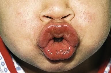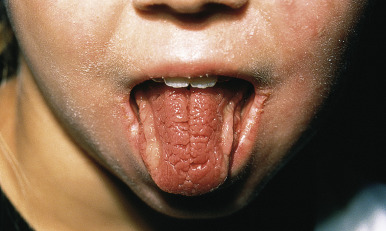 Orofacial granulomatosis (OFG; also called cheilitis granulomatosa or granulomatous cheilitis ) ( Fig. 25-15 ) is characterized by face and lip swelling (macrocheilitis). It is the most common manifestation (93% with facial swelling and 66% with lip swelling) of Melkersson–Rosenthal syndrome, which also includes recurrent facial paralysis and a furrowed or “scrotal” tongue (lingua plicata) ( Fig. 25-16 ). Furrowing of the tongue and facial palsy have each been reported to occur in approximately 30% of patients. No prodrome warns of attacks, and patients experience no associated erythema, pain, or pruritus. The disorder is more prevalent in males and has a mean age of onset of 11 years. The swelling can increase the size of the lip by twofold to threefold, leading to chapping from exposure of the mucosa. Both lips may be involved, and the swelling may be bilateral or unilateral. In addition to the swelling of the lips and other oral mucosal structures, the eyelids may be swollen. The attacks usually disappear within days or weeks but commonly tend to persist after several recurrences. Facial palsy usually occurs on the side of the facial swelling and tends to resolve spontaneously.