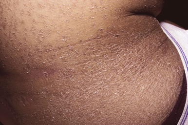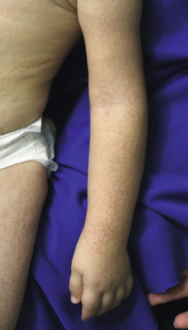 Sarcoidosis in preschool-age children differs from that of older children, adolescents, and adults, and is characterized by polyarthritis and severe uveitis (commonly suggesting a diagnosis of juvenile idiopathic arthritis [JIA]), cutaneous manifestations, and a conspicuous absence of pulmonary abnormalities ( Table 25-5 ). The majority of young children with this presentation (also called early-onset sarcoidosis [ EOS ]) have been found to have heterozygous mutations in CARD15. As such, EOS is considered to be the sporadic form of Blau syndrome, an autosomal dominant disorder with the cutaneous granulomas and other features of EOS. Blau syndrome/EOS is associated with increased flaring and morbidity and a poorer prognosis than sarcoidosis in older children and adults. The complete classic triad (skin eruption, arthritis, and recurrent uveitis) occurs in 42% of patients with Blau syndrome, and cutaneous features are usually the first to appear. Generalized asymptomatic small erythematous papules on the trunk and extremities are most commonly seen ( Figs. 25-22 and 25-23 ), often leaving small pitted scars as sequelae. However, the cutaneous lesions have variably been described as eczematous, ichthyosiform (misdiagnosed as ichthyosis vulgaris), or lichenoid. Relapses and remission are common. Erythema nodosum is the second most common skin manifestations of Blau syndrome, and leukocytoclastic vasculitis involving skin has also been described.