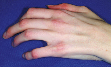 Boggy synovitis and tenosynovitis of the wrists, fingers, knees, and ankles are characteristic and show symmetric nonerosive arthritis radiographically. Despite the chronicity, joint destruction is uncommon, and range of motion is usually not reduced, in contrast to the arthritis of JIA. However, the proximal interphalangeal joints disproportionately develop contractures, leading to camptodactyly (usually congenital flexion contracture of a finger). Bone dysplasia can also be seen.