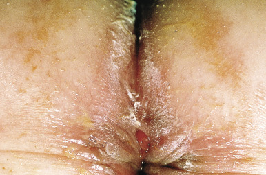 Other mucocutaneous manifestations are more specific for Crohn disease. Cobblestoning of the buccal mucosa is seen in up to 20% of affected individuals. Painless swelling of the lips, resembling OFG, may be the initial presentation of Crohn disease in a child or adolescent and may precede the gastrointestinal symptoms by several years ( Fig. 25-19 ). Similarly, the vulva may show erythema, swelling, and fissuring, and the scrotum and penis may be swollen and erythematous. Perianal lesions may extend onto the adjacent perineum, abdomen, or buttocks with fissures, and sinus tracts are common. Nasal perforation and chronic granulomatous otitis externa have been described. Abdominal surgical sites may also be loci for cutaneous involvement. Biopsy provides the clue to diagnosis, although the noncaseating granulomas resemble those of Melkersson–Rosenthal/cheilitis granulomatosa and sarcoidosis. Special stains (periodic acid–Schiff, Ziehl–Nielsen and Gram) are important to consider infectious causes of granulomas. These granulomatous lesions of the lips and anogenital area are considered “contiguous” Crohn disease because of their proximity to the gastrointestinal tract. Granulomatous lesions elsewhere are considered extraintestinal (sometimes called metastatic ) cutaneous Crohn disease. These lesions typically are dusky red, swollen/indurated plaques, most commonly found on the genital region of children, lower extremities, abdomen, or trunk; lesions less commonly show no erythema or are ulcerating.