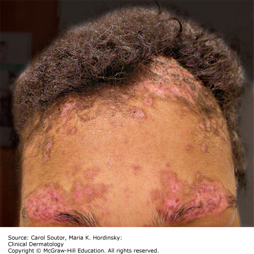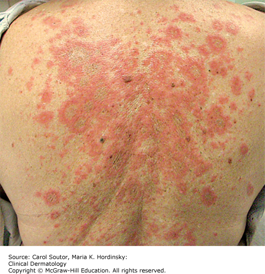 SCLE presents with a sudden onset of figurate, annular, arcuate, or psoriasiform lesions that are typically nonscarring and nonatrophic in a photodistribution (face, neck, extensor arms); however, the upper trunk is also commonly affected (Figure 24-4). Systemic symptoms are frequently absent or of minimal intensity. SCLE is often drug induced and can persist long after the causative drug has been withdrawn.1