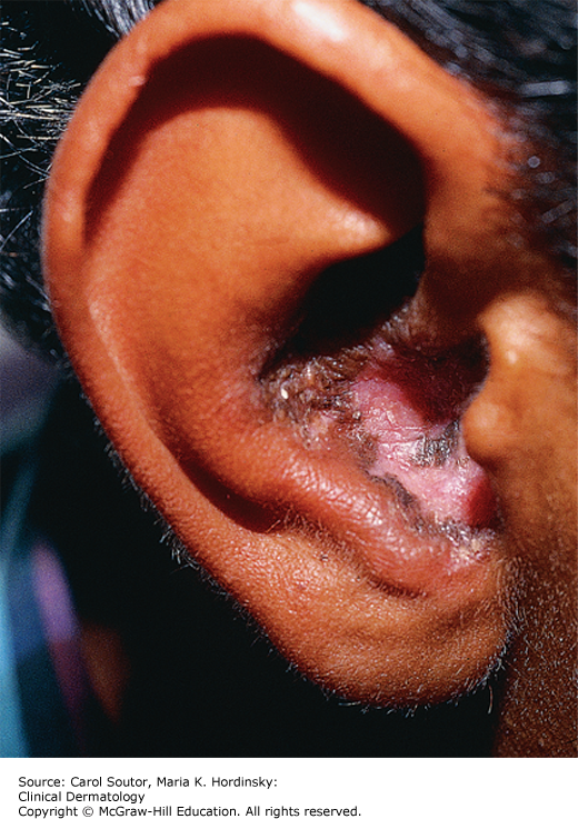 The primary lesion is an angular, plaque with “follicular plugging,” central atrophy and peripheral hyperpigmentation, and erythema (Figures 24-1 and 24-2).1 Pruritus or burning are common symptoms. The lesions are primarily located on sun-exposed areas, generally the face, arms, scalp, upper chest, and back. Conchal fossa (bowl) scarring of the ear is almost pathognomonic (Figure 24-3). The scarring lesions of DLE may be disfiguring in patients with darker skin pigmentation, leaving permanent hypo- or hyperpigmentation. Scalp lesions may result in permanent hair loss due to scarring alopecia. Variants of DLE include hypertrophic, diffuse, and tumid, the latter two being less common.