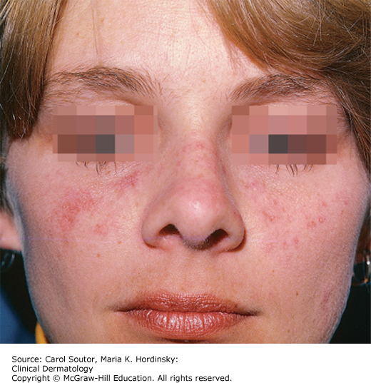 Skin symptoms are minimal and usually consist of pruritus or increased sun sensitivity. Systemic symptoms are common and include arthralgias, myalgias, fatigue, malaise, fevers, chills, night sweats, weight loss, headaches, visual changes, and diffuse hair loss. Raynaud’s symptoms are common. Cutaneous lesions though sometimes “discoid lupus” like, are generally diffuse, nonscarring and often nondescript. The “butterfly rash” (erythema with fine scale over the malar area) is one of the criteria for the diagnoses of SLE (Figure 24-5).1