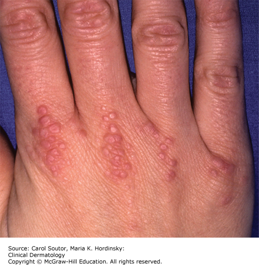 Intensely pruritic, diffuse, scaly erythematous patches in the scalp with postauricular erythema are characteristic findings.3 Similar patches are often found on the upper back shoulders, upper chest (shawl sign), and deltoid regions. Pathognomonic findings include periorbital erythema (heliotrope) and violaceous papules over the joints of the dorsal hands (Gottron’s papules) (Figure 24-6). Periungual erythema may be present. Patients may complain of photosensitivity and proximal muscle weakness (eg, difficultly in climbing stairs or raising arms above the head).