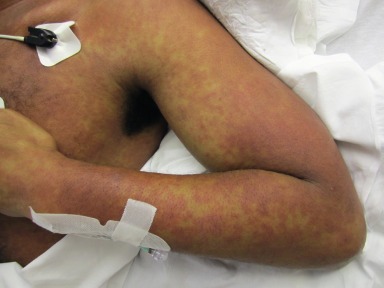 A wide spectrum of diseases can present with fever and rash, including infections, drug reactions (e.g., DRESS; Fig 23.1 ), collagen vascular diseases, and vasculitis. These causes are listed in Table 23.1 , according to the primary cutaneous lesions: macules and papules, purpura, nodules and plaques, vesicles and bullae, and pustules. Some of these diseases (e.g., meningococcemia; Fig. 23.2 ) are life threatening and require prompt diagnosis and treatment.