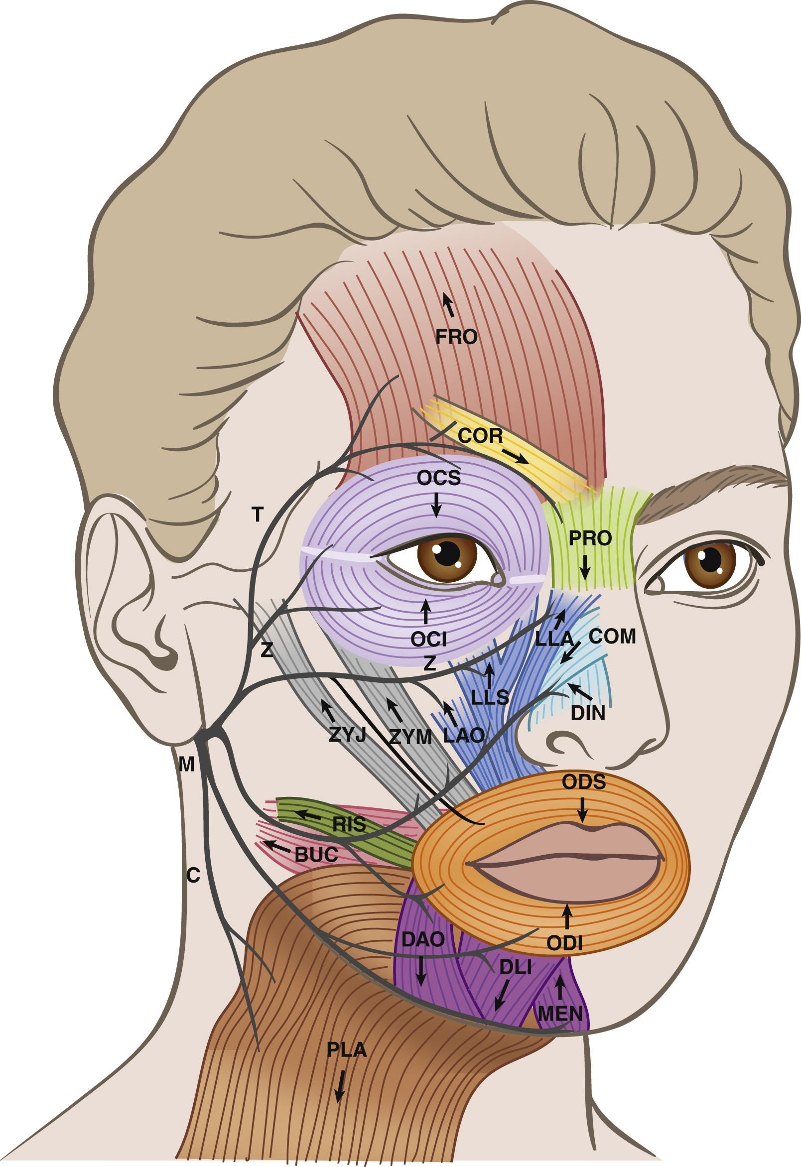 Muscles of the facial expression relevant to the smile include the perioral muscles as well as elevators and depressors of the lips and oral commissure ( Fig. 5.1 ). The orbicularis oris (OO) muscle is responsible for closure of the lips and puckering is innervated by the buccal and marginal mandibular branches of the facial nerve and is in close proximity to the depressor anguli oris (DAO), depressor labii inferioris (DLI), and mentalis (MEN) muscles (also innervated by the marginal mandibular nerve branches). The DAO depresses the oral commissure, whereas the DLI depresses the lower lip and is key in showing the lower teeth in a full denture smile. The MEN counteracts the DLI and elevates the central portion of the lower lip helping the pouting of lips. Platysma (PLA) muscle fibers of the neck innervated by the cervical branch interdigitate with the lower facial muscles, playing a role in downward action of the oral commissure and lower lip. The upper lip and oral commissure elevators are innervated by the buccal and zygomatic branches and include the zygomaticus major (ZYJ), zygomaticus minor (ZYN), levator anguli oris (LAO), levator labii superioris (LLS), and levator labii superioris alaeque nasi (LLA). Risorius (RIS) and buccinator (BUC) muscles innervated by the buccal branch provide lateral pull of the oral commissure.