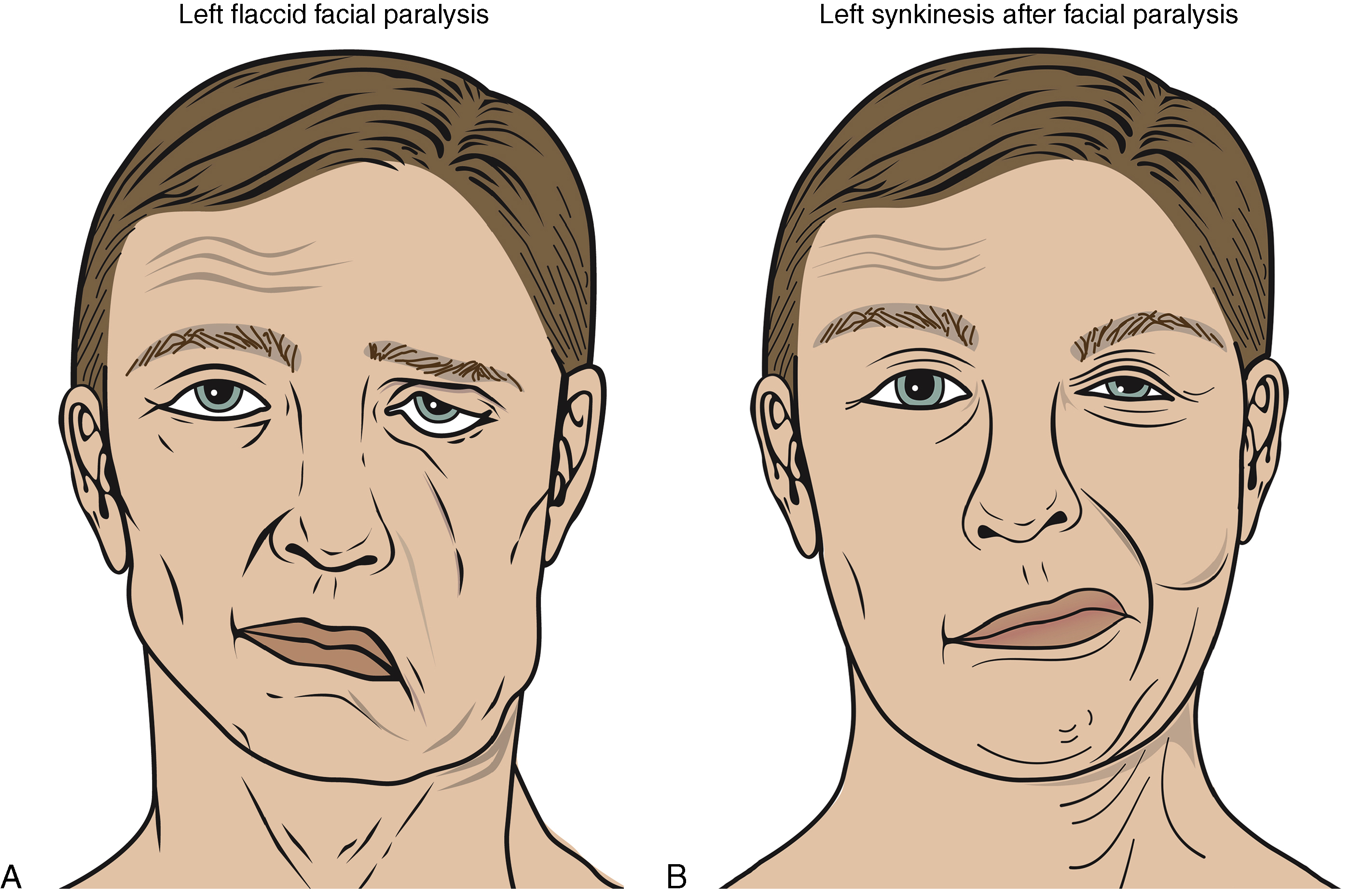 Patients presenting with chronic symptoms of paralysis require a thorough history to be taken and careful physical examination to differentiate between hypofunction, hyperfunction, or mixed recovery between different facial muscles. Those who develop synkinesis will often have reported recovery of function only to later develop symptoms of hypertonicity of recovered muscles and involuntary facial movements. Patients typically report the initial phase of synkinesis as a deterioration of their recovery as volitional movements become restricted.