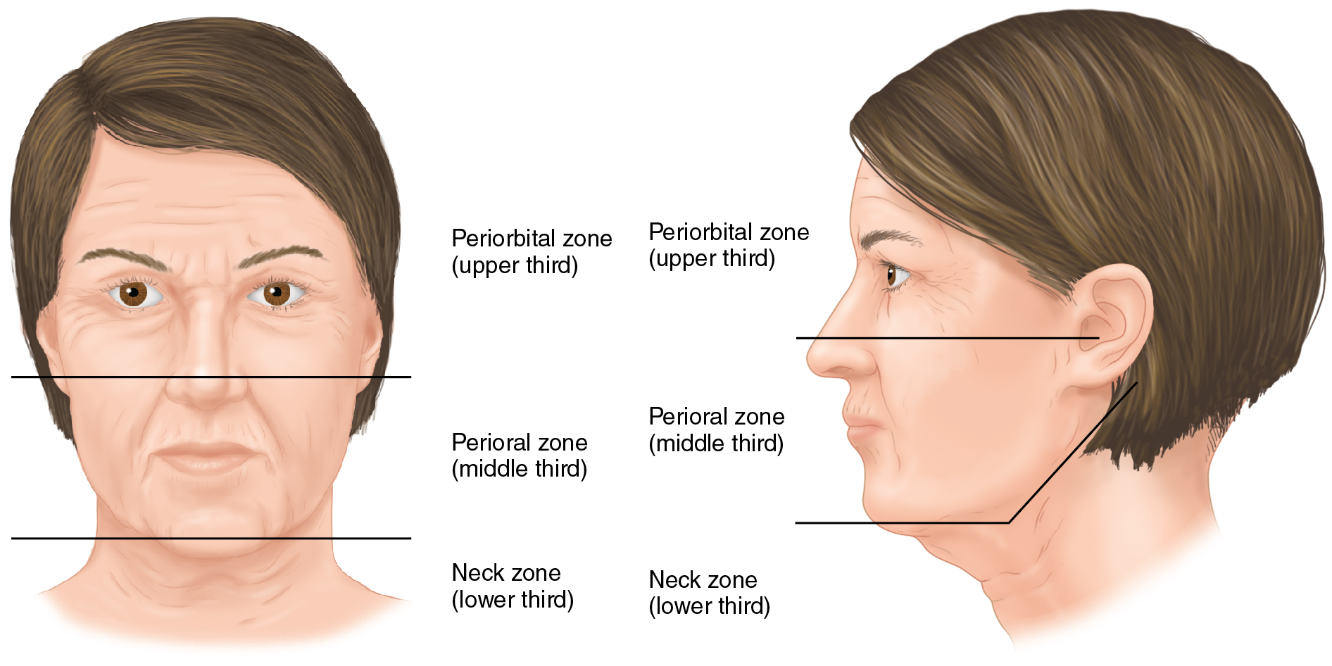 The evaluation begins with a visual assessment of the overall surface changes of the face. A systematic method of assessment includes evaluation of the face globally from top to bottom, dividing it into thirds. Starting from the hairline (trichion) to the chin (menton), or vice versa, can make the process objective and standard and facilitates communication and medical records. All the changes on the skin surface, facial volume, and positions of symmetrical facial structures are noted. The neck segment is considered the lower third in this facial analysis ( Fig. 34.1 ).