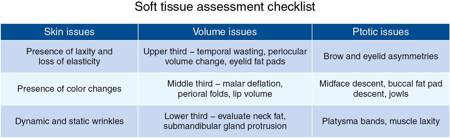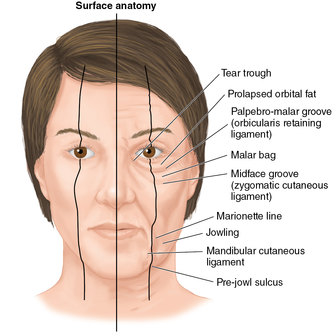 The soft tissues of the face are a complex arrangement of skin, subcutaneous tissue, muscles, glands, and neurovascular structures connected in several places to the facial skeleton by connective tissue, septa, and ligaments. The smooth, rounded contour of a young face progressively changes with age as the tissues suffer structural alterations. Various predictable surface, volume, and ptotic changes take place. Dyschromia, rhytids, loss of skin elasticity, soft tissue deflation, and descent are the most common signs of aging that we encounter during the assessment of a patient seeking facial rejuvenation.