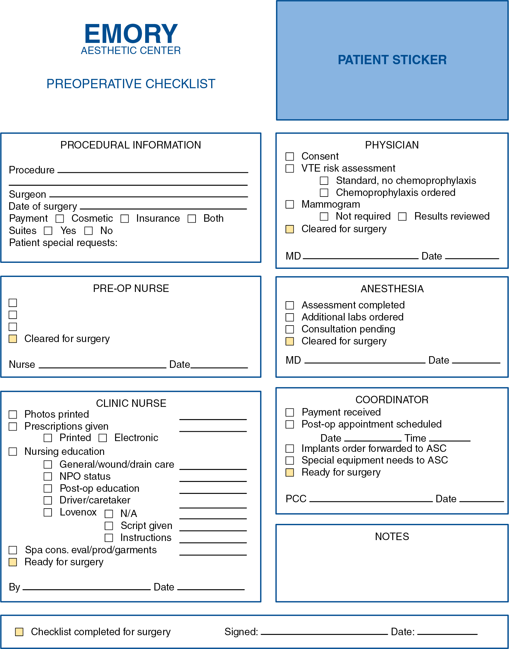 In our plastic surgery center all patients are scheduled for a formal preoperative visit with the surgeon, the nursing team, and the anesthesiologist 2 weeks before the procedure to review all the details of the surgical procedure, provide prescriptions, plan for medication discontinuation, perform the venous thromboembolism (VTE) risk assessment, evaluate the need for preoperative testing, address special equipment needs, confirm surgery payment, and any other preoperative requirements ( Fig. 34.4 ).