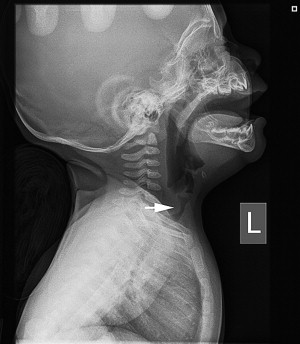 Less common sites affecting the airway include postcricoid, tracheal, mediastinal, thoracic, and esophageal. They may stain the posterior trachealis muscle (see Fig. 4 ). Airway symptoms include biphasic stridor and recurrent croup. Diagnosis may be suggested by history and lack of another cause of subglottic stenosis, such as prolonged intubation. Plain neck films may suggest the diagnosis.