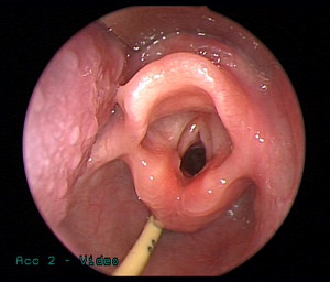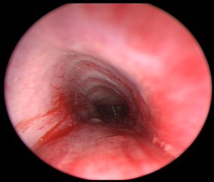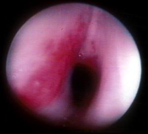 Microlaryngoscopy is performed with a rigid anterior commissure-type laryngoscope such as a Benjamin or Parsons placed in the vallecula ( Fig. 2 ) and used to expose the endolarynx and subglottic airway. This will reveal a subglottic hemangioma just below the vocal cords ( Fig. 3 ). Magnification from a Storz Hopkins telescope is used to visualize the subglottic airway and the scope can be passed down to the level of the carina. It is important to carefully look at the trachealis muscle in the back wall of the trachea for staining, fullness, and signs of vascular disease ( Fig. 4 ). Tracheal hemangioma may be subtle and its treatment is challenging.