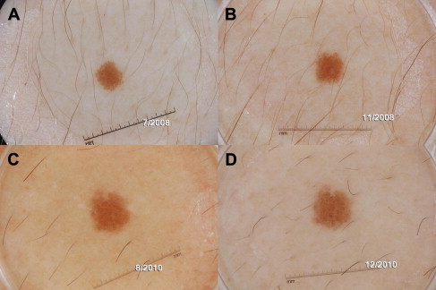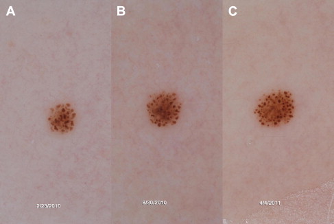 What is recurrently underscored in studies of Spitz nevi is that their clinical and histopathologic morphology often overlaps with melanoma. While Spitz nevi are benign neoplasms that do not result in widespread metastasis and death, their biology and natural history remain to be fully elucidated. Their etiology, rate of growth, and factors inducing senescence and involution remain active areas of research. Evidence is slowly accumulating that a subset of Spitz nevi, specifically those with a starburst pattern, has a predictable pattern of growth ( Figs. 1 and 2 ). In addition, it has been documented that Spitz nevi can involute. That said, it is clear that aggressive biological behavior of a subset of Spitzoid lesions, particularly those displaying rapid growth and/or lymph node involvement, does occur and can cause alarm. Based on the information currently available on Spitz nevi, management decisions often seem to be propelled by the low pretest probability of developing melanoma in children compared with adults. Thus, pediatric dermatologists are often more inclined toward conservative monitoring of Spitz nevi in children, whereas dermatologists dealing with Spitz nevi in adults often prefer to biopsy these lesions.
