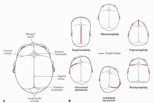 FIG 1 • A. Cranial sutures. B. Most common types of craniosynostosis and their associated shape change. (© WFBHS Plastic Surgery Collection.)
