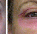(L) Patient before surgery for upper and lower blepharoplasty. (R) Patient 5 days after surgery with a transconjunctival lower blepharoplasty approach. Skin laxity of upper and lower eyelids dramatically corrected. Fat protrusion of lower eyelids treated with minimal fat excision. OOM contracted in defocused laser beam in upper and lower eyelids. Observe the sutures of the upper eyelids still in place. Suture removal takes place in 5 days postop. As shown, patient admitted with no ecchymosis, obvious edema, or other postoperative signs on the fifth postop day