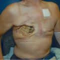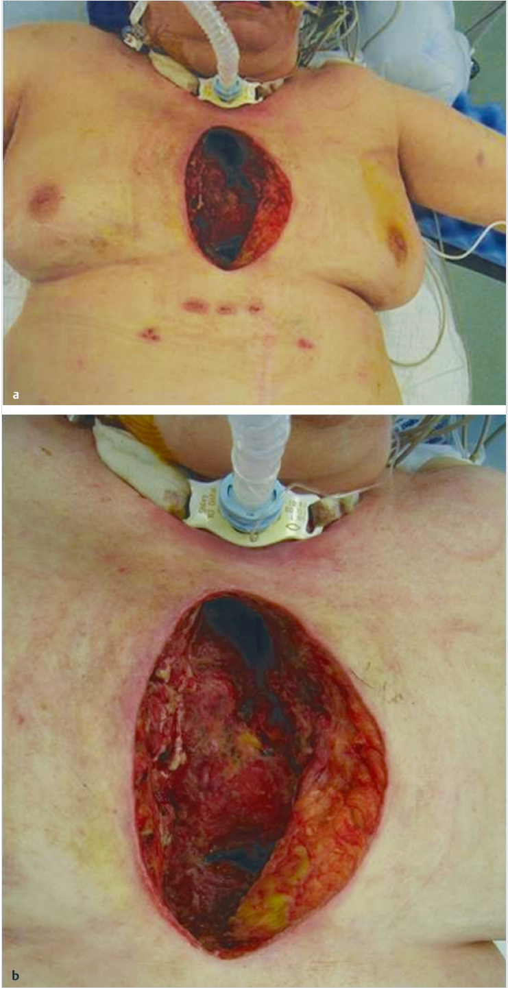 Patient with evidence of an anterior midline chest wall wound measuring roughly 15 × 8 cm.