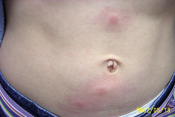 Pruritic, erythematous, raised hivelike fleabites, often referred to as papular urticaria, appearing on the abdomen in a previously sensitized individual.