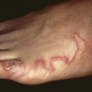 Cutaneous larva migrans appears on the lateral foot as a thin, linear, serpiginous, raised, tunnel-like lesion. When palpated, it has the consistency of an underlying thin string (Fitzsimons Army Medical Center Collection).