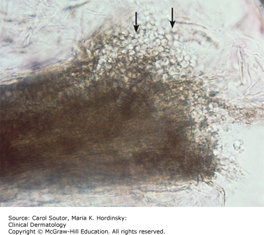 KOH examination of the proximal hair fiber of T. tonsurans infections shows large spores within the hair shaft (endothrix) (Figure 10-1). Microsporum infections have smaller spores, primarily on the surface of the hair shaft (ectothrix). KOH evaluation of hair fiber specimens can be difficult, and interevaluator variability is common.