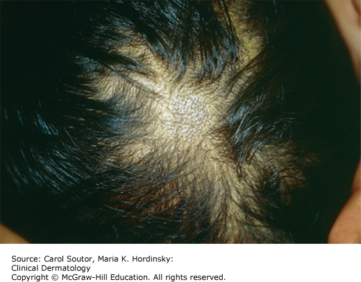 Areas of alopecia dotted with broken hair fibers that appear like black dots (Figure 10-2)