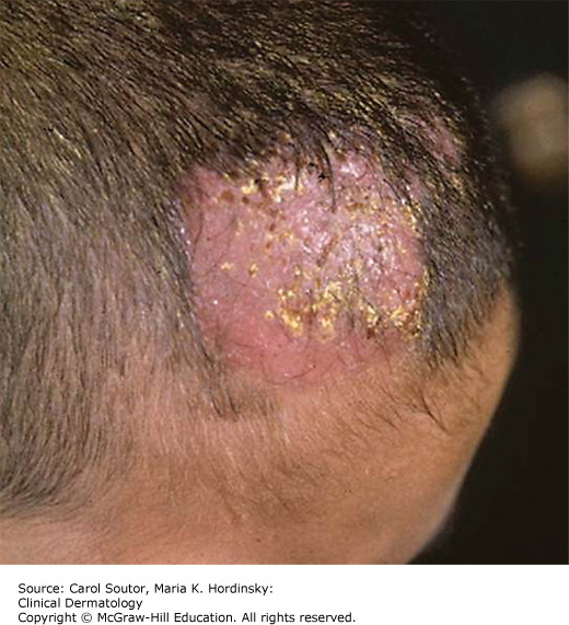 Kerion, a boggy, thick, tender plaque with pustules (Figure 10-3) that is caused by a marked inflammatory response to the fungus. This is often misdiagnosed as a tumor or bacterial infection