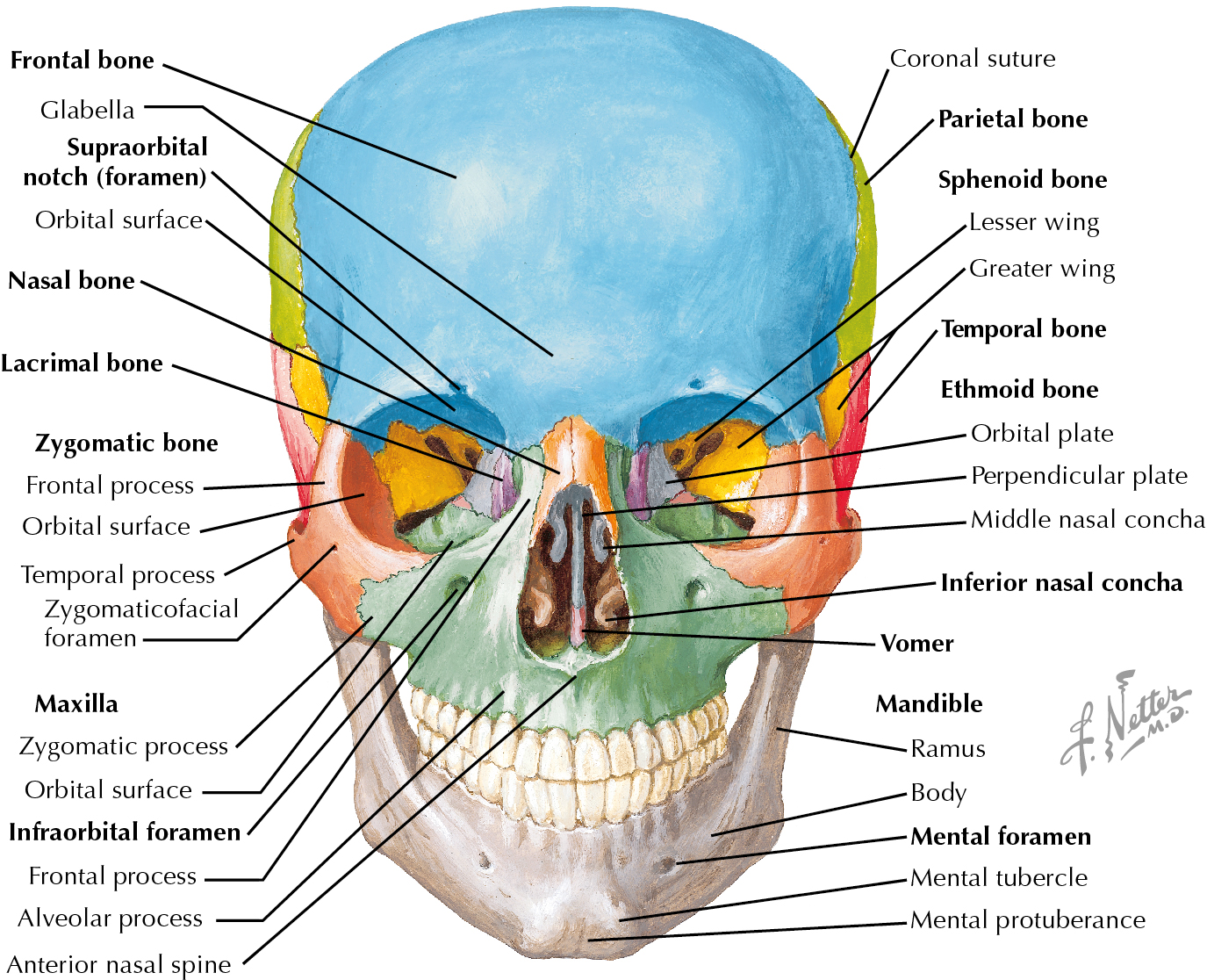 The face is composed of bony and soft tissue components, both of which are important to form and function. The soft tissue of the face will be primarily discussed in this chapter; however, understanding the skeletal anatomy is crucial. The skull or cranium is the skeleton of the head and is made up of two subdivisions: neurocranium and viscerocranium. The neurocranium provides the covering of the brain and comprises the calvaria and the cranial base. The calvaria are made up of the frontal, parietal, and occipital bones. The sphenoid and temporal bones help make up the cranial base. The ethmoid bone primarily is a part of the viscerocranium but makes a small contribution to the skull base. The viscerocranium or facial skeleton is composed of 15 bones that make up the mouth, jaws, nasal cavity, and eye sockets. Midline bones include the mandible, ethmoid, and vomer. Lateral to this are the maxilla, inferior nasal conchae, zygomatic bones, palatine bone, and lacrimal bone. The mandible and the maxilla house teeth and make up the oral cavity. The facial skeleton is commonly divided into the lower, middle, and upper thirds. The lower facial skeleton primarily consists of the mandible. The midface is composed primarily of the maxilla, and the upper third of the face primarily comprises the frontal bone ( Fig. 10.1 ).