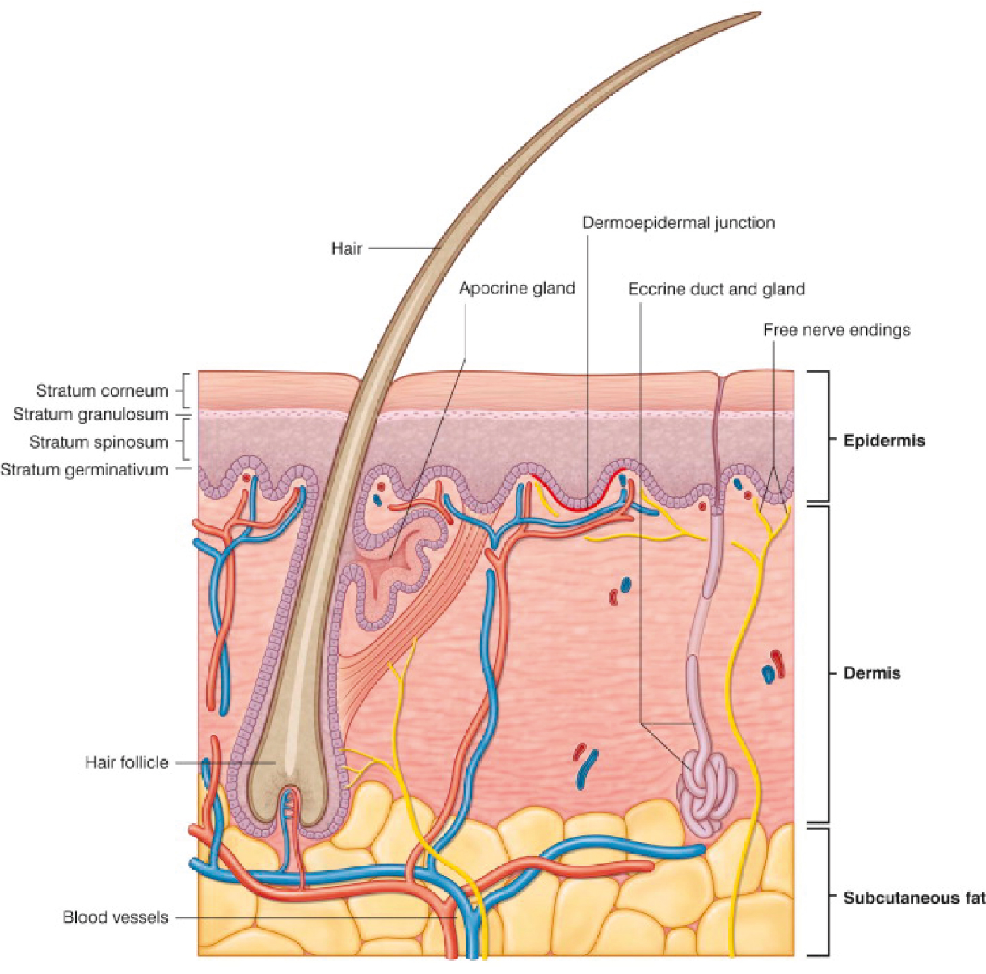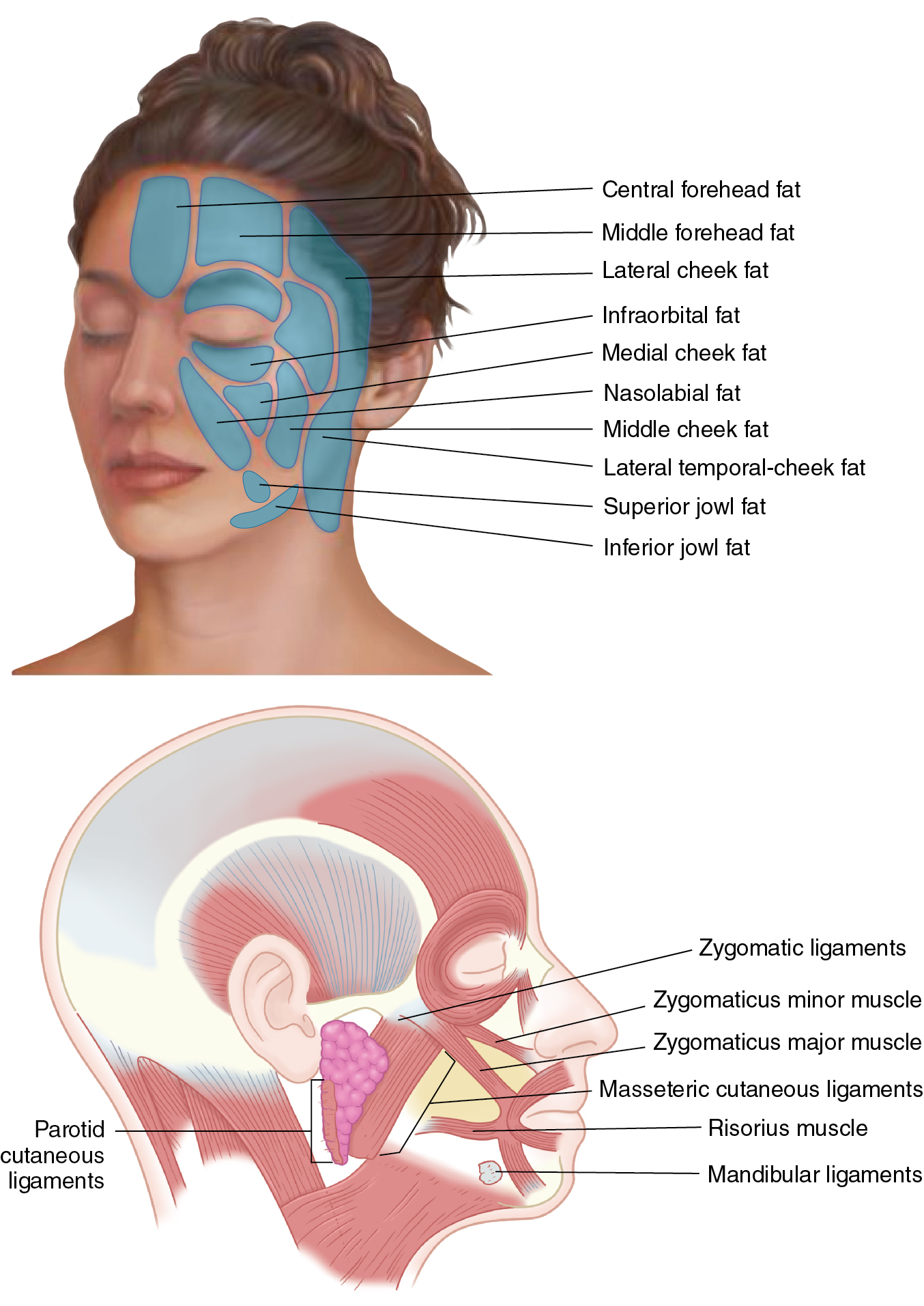 The soft tissues of the face have many components. Facial skin is made of the epidermis and the dermis ( Fig. 10.2 ). Facial skin varies widely from one person to the next and with age, but the thickness of the skin tends to be proportionate among people. The nasal tip skin tends to be 3.3 times thicker than the eyelid skin. The brow/forehead and nasal dorsum is 2.8 and 2.9 times thicker than the eyelid skin, respectively. The intrinsic elasticity of the skin is important for surgeons to understand. The dermis can be inflexible on the back and scalp, and small degrees of rotation can result in protrusion at the pivot point, whereas with areas with much elasticity, such as the face, tissue can be moved with greater ease and malleability. Intrinsic tissue elasticity is based on many factors: age, photodamage, and anatomic location. Below the skin is the subcutaneous fat, which is organized into compartments with the help of retaining ligaments. Subcutaneous fat, its compartments, and the retaining ligaments of the face are all crucial components to dissection and surgical manipulation. The subcutaneous fat of the face has been studied and found to be highly compartmentalized, and aging of the face is likely a combination of laxity of the retaining ligaments, volume loss, and malposition of the compartments of the face. Understanding the anatomy of the fat compartments and retaining ligaments is essential for surgeons.