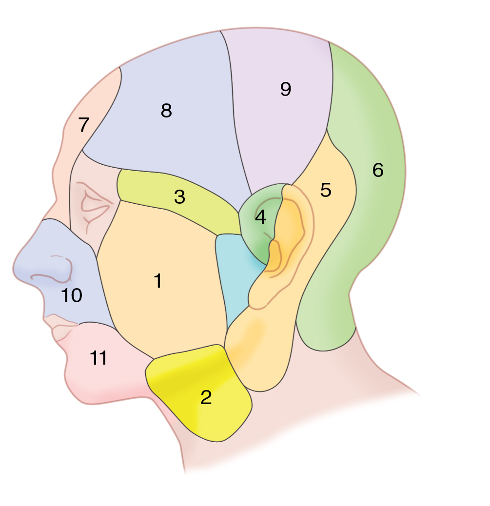 Mathes et al. evaluated the arterial anatomy of the face and territories of cutaneous perforating vessels. They found that there are 11 defined vascular territories to the face and scalp ( Fig. 10.5 ). These territories are supplied primarily from separate arteries: transverse facial, submental, zygomatico-orbital, anterior auricular, occipital, supratrochlear, superficial and parietal branches of the superficial temporal, and superior and inferior labial arteries. These territories have three patterns of arterial vascularization: (1) small densely populated musculocutaneous perforating arteries supplying the anterior face, (2) large sparsely populated fasciocutaneous perforators that occur in predictable locations supplying the lateral region of the face, and (3) small densely populated fasciocutaneous perforators supplying the scalp. The deep circulation of the anterior face (facial artery and supratrochlear artery) courses deep to or through the facial muscles. Those vessels perforate the subdermal plexus through small, fine musculocutaneous arteries. The lateral face deep circulation (transverse facial, submental, and posterior auricular arteries) is in the parotideomasseteric plane and perforates the subcutaneous plane in constant sites and then undergoes further branching once in the subdermal plexus. The scalp vessels run superficial to the galea, and a dense population of vessels perforates the superficial fascia of the scalp and supplies the dermis and skin.