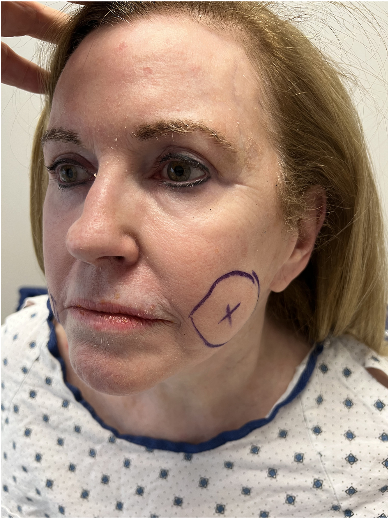 The buccal extension of the buccal fat is marked preoperatively on the patient’s face.